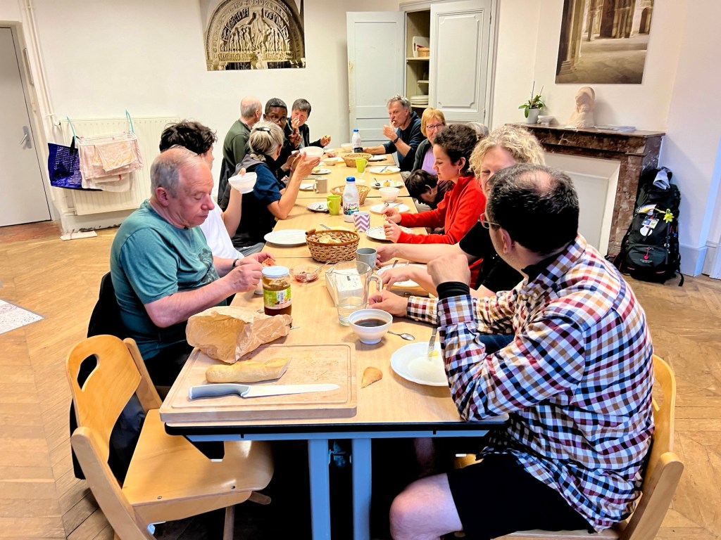 Before the mass we all joined up again for a typical French breakfast of bread, jam and a bowl of tea or coffee. Not the best to walk on, but I had some cheese in my pack for later.