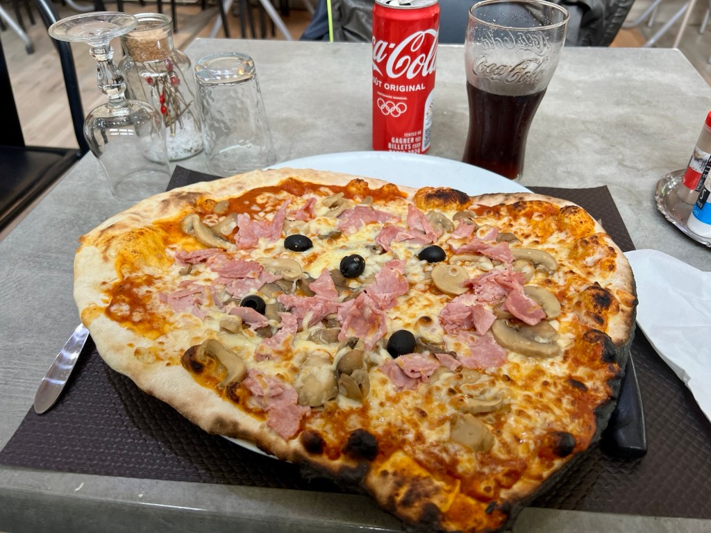 I walked seven very wet kilometers, and arriving at my destination at noon I knew there was no way I was going to get into my accommodation yet. So Mr. Google told me that there was a pizza restaurant in town and that it was actually open on a Sunday! Such good fortune. so that’s what I did. I went out to lunch.
