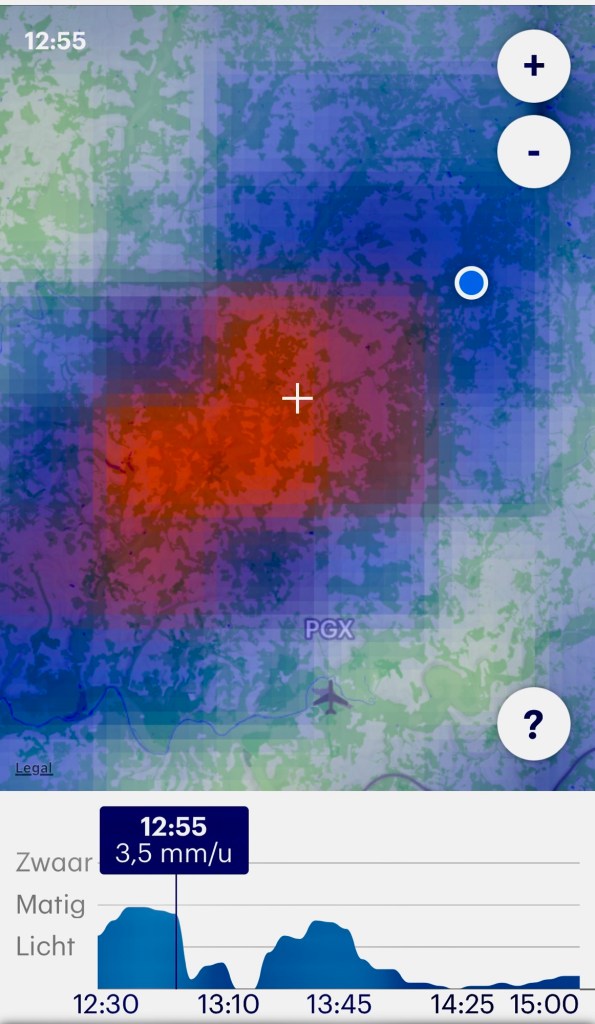 As I watch the radar from time to time, I wondered at what point I’d have to put on my rain gear. I would pick a marker in the distance, say a large tree, and see if I could just get there before the rain came. This continued for quite a while, but I was still at least 5 km away from my destination. It wasn’t looking very good, but I still had time on my side.