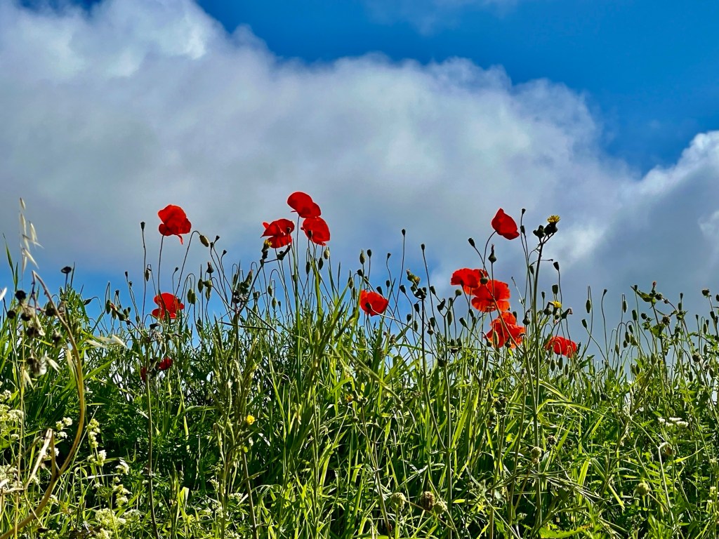 Another handsome orange cat, although he needs to ease off on the kibble. The poppies are glorious against the grass and sky. Ken