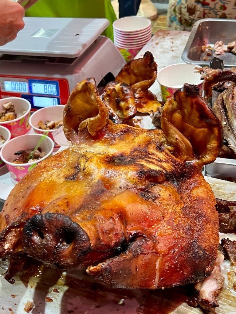 This association was selling off bits of four roasted hogs with money donated to cancer society. We wanted to contribute but we didn’t like the parts being chopped up as we passed. A lot of fat.