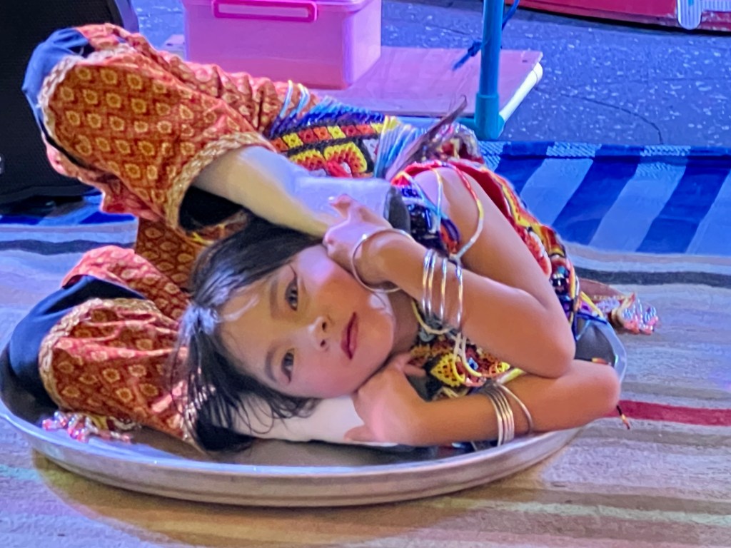 This was a bit odd. A very flexible child we think being made to do this by her father with a money donation bin to fund her education.