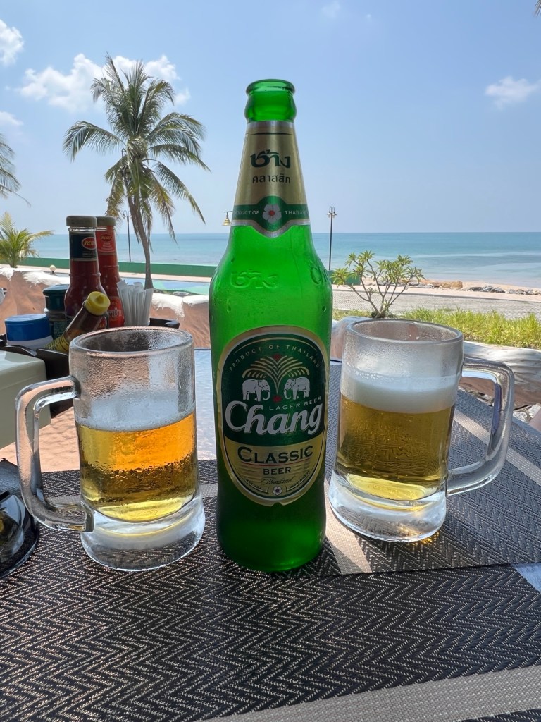 AM got us underway with some sort of cocktail and seemed to be enjoying it. I enjoyed a cold Chang beer with a thick foam holder to keep it cold. 😋