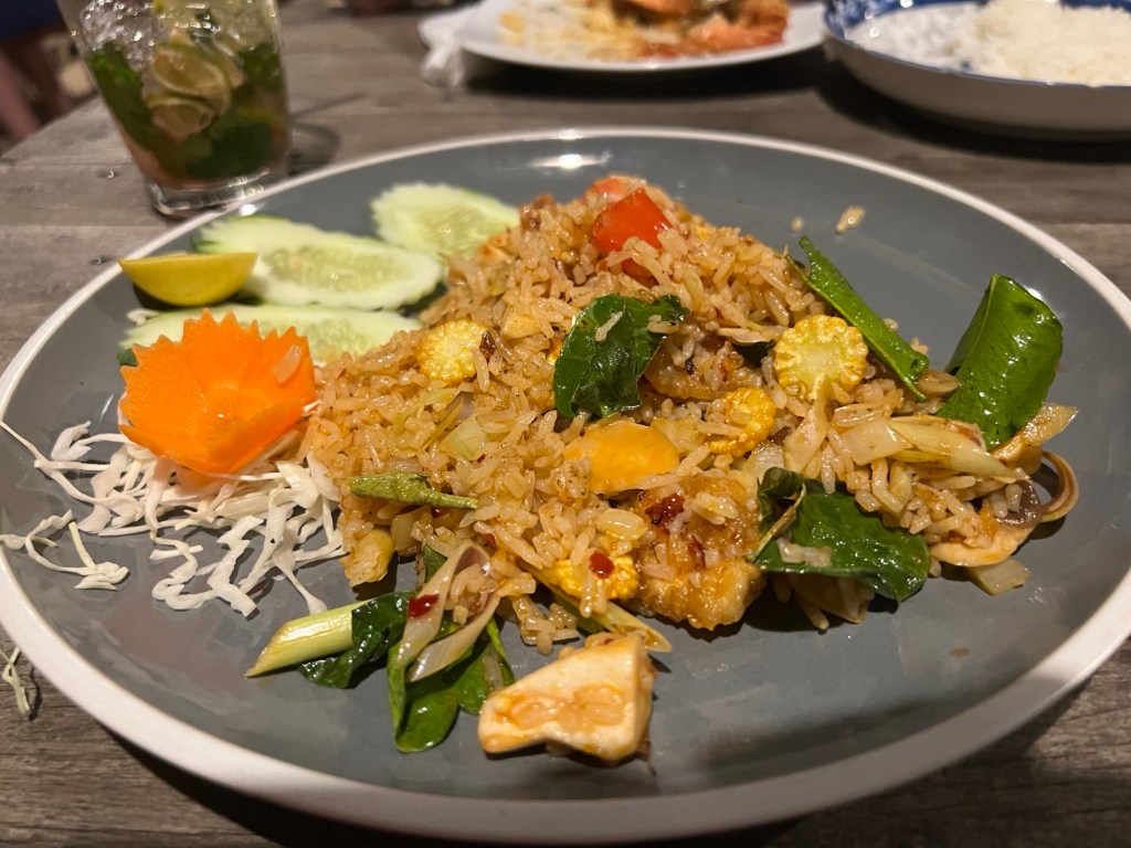 I ordered steamed squid and a plate of fried rice with chicken, bamboo shoots, and various hot chilies and other veggies. It was rather toasty, but I ate it all! I’m enjoying experimenting with the various dishes. There are so many to choose from. I’ll likely not see most of them at our local Thai restaurant at home, but perhaps after this trip AM will be more excited about going there. 🙂