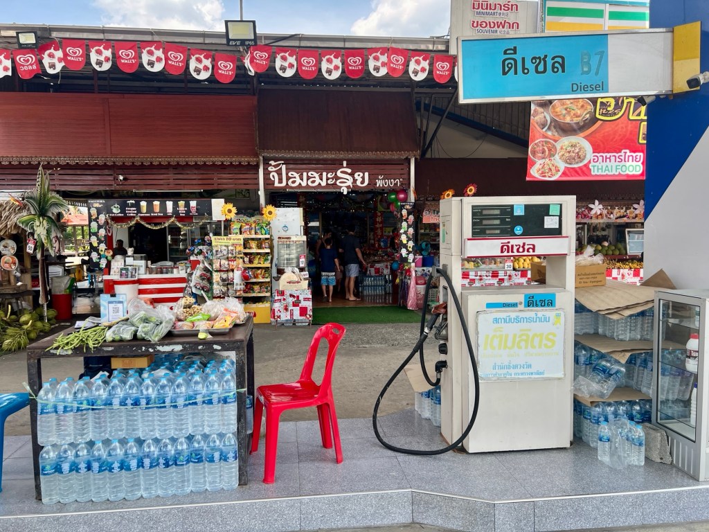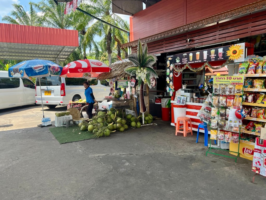 I stopped at a fuel station for a break. they are a bit different here. Yes you can buy food and drinks, and you can also buy coconuts with a straw!
