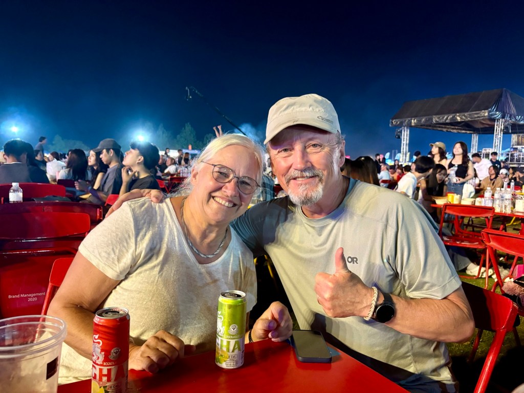 The evening was now just getting started. A huge stage with thousands of seats had been set up. Rather, thousands of tables with thousands more chairs had been set up. I couldn’t imagine the work it took to pull this together. There must have been a team of hundreds. The concert seating area was surrounded by dozens and dozens of food stalls, and of course drinks/beer booths.