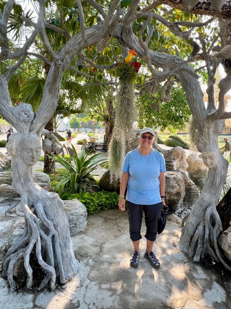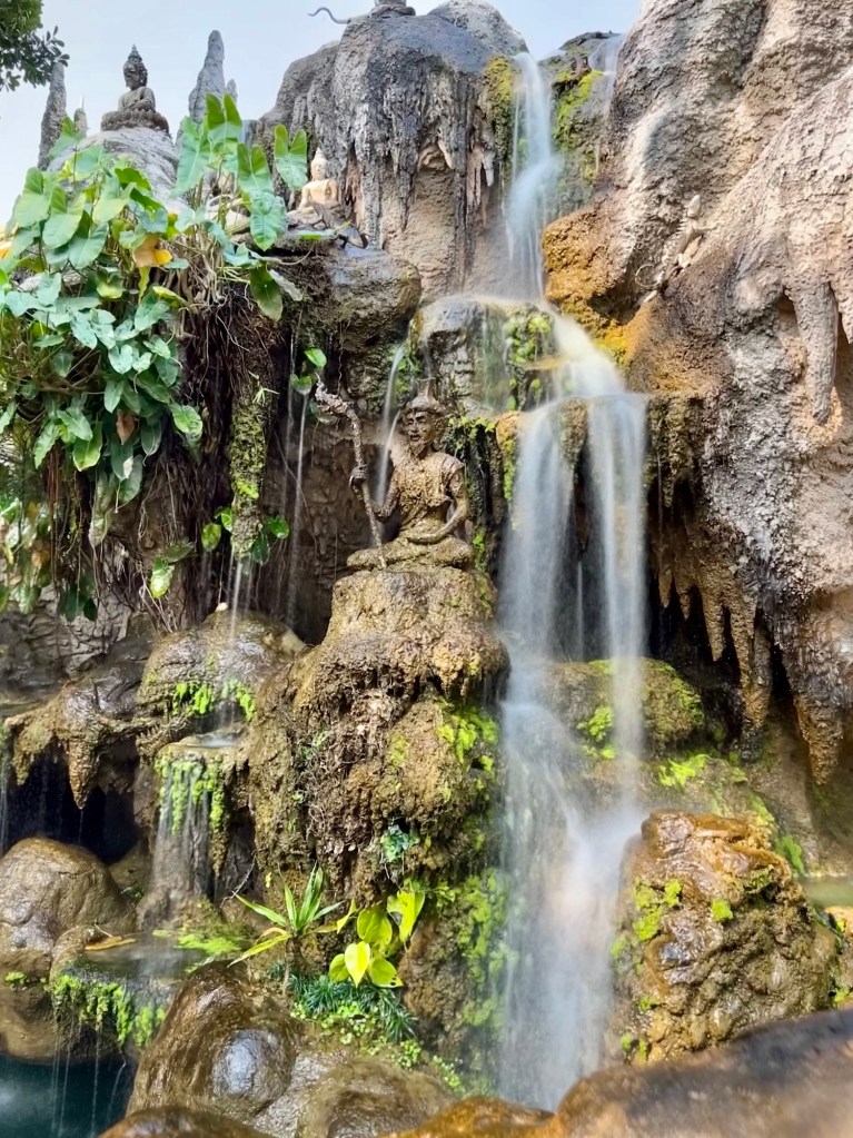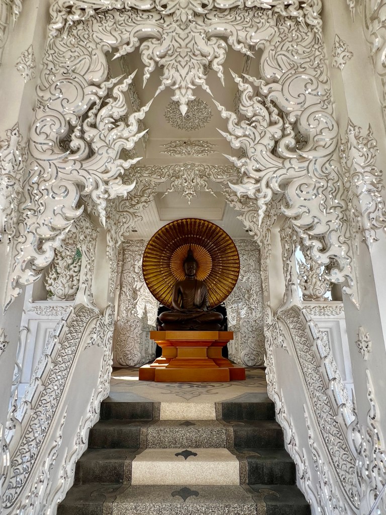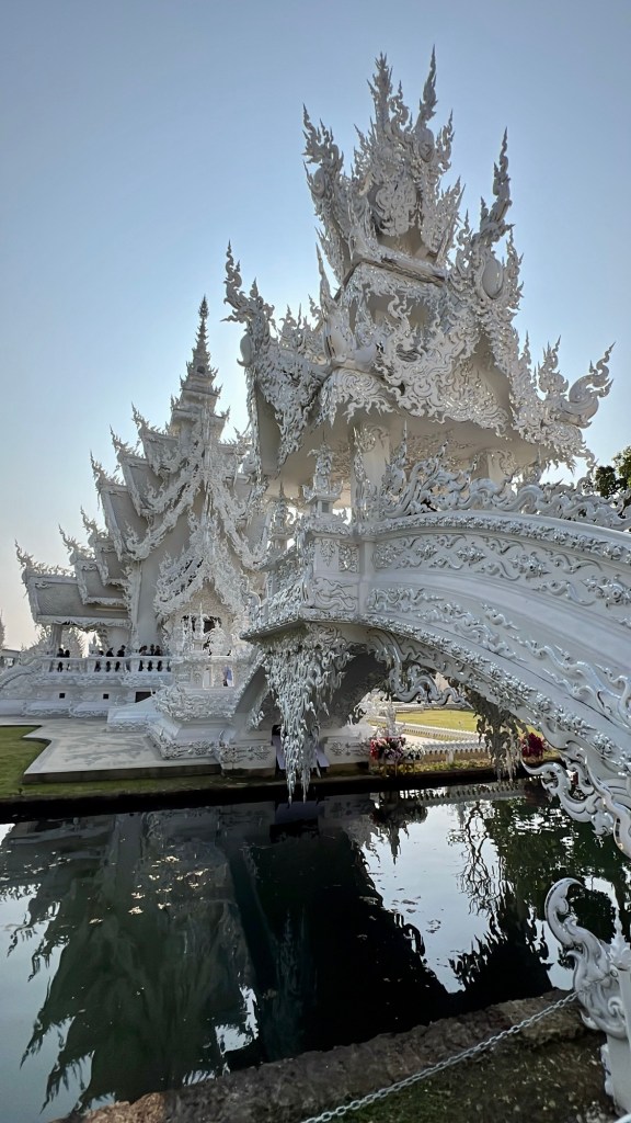In 1997 a designer named Arjan Kositpipat who was a prominent Thai artist stepped in to complete the temple wanting as a Buddhist offering to do something special to honour Buddhism, the local people and the Thai King who he particularly liked. The connection with the Blue Temple is that one of his students rebuilt and redesigned this temple. Hence the similarities that I think you’ll see in my photos. I also read that several of his other students were also involved.