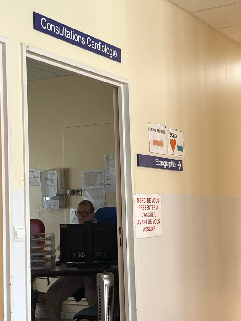 And then it was on to the hospital. What a process that was! Trying to figure out how to check in when nobody spoke English. However, I mentioned my friend Isabelle‘s name, and Presto! She walked up and greeted me. She helped me to finish off the check-in process, and to pay for my emergency visit a week ago, and then she actually walked me upstairs to the cardiology department. What a lovely person.