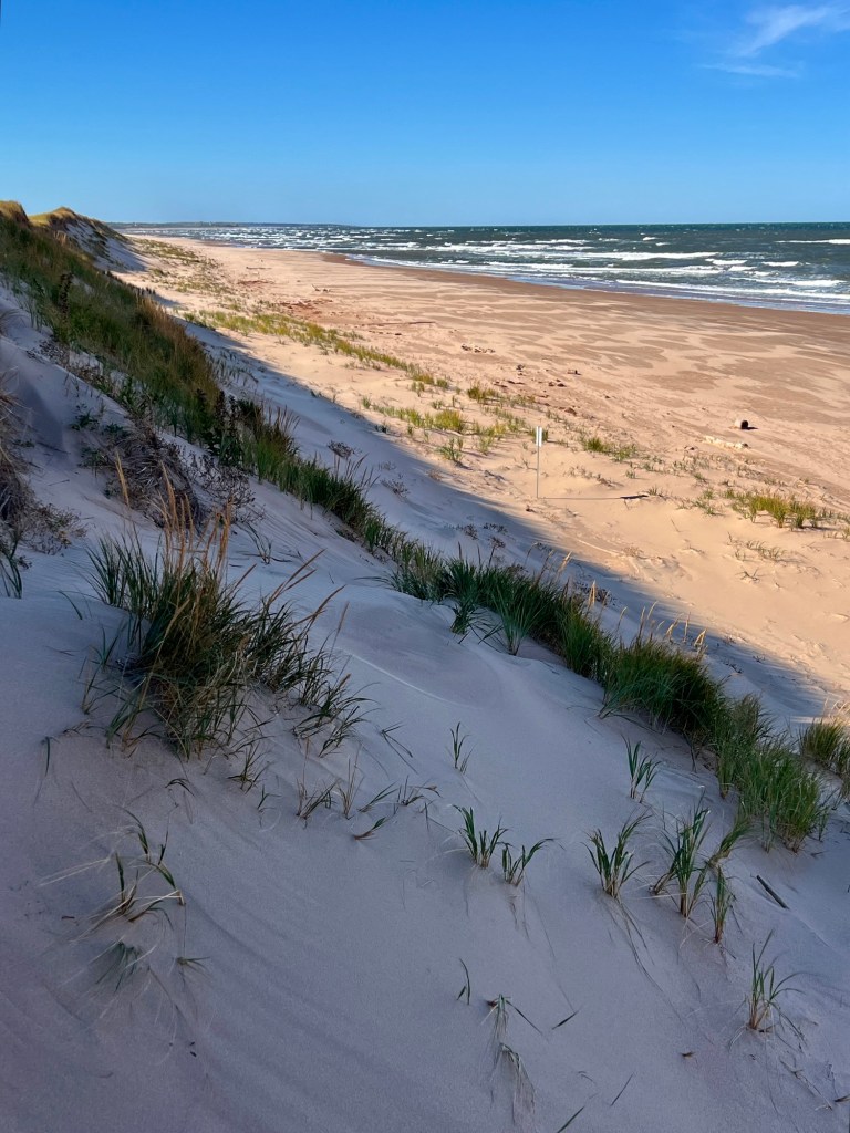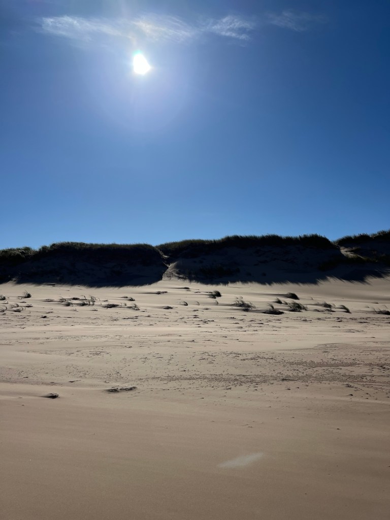 We climbed up over the lower dunes on the right in the above photo and found a wind swept, seemingly untouched beach. Heaven…